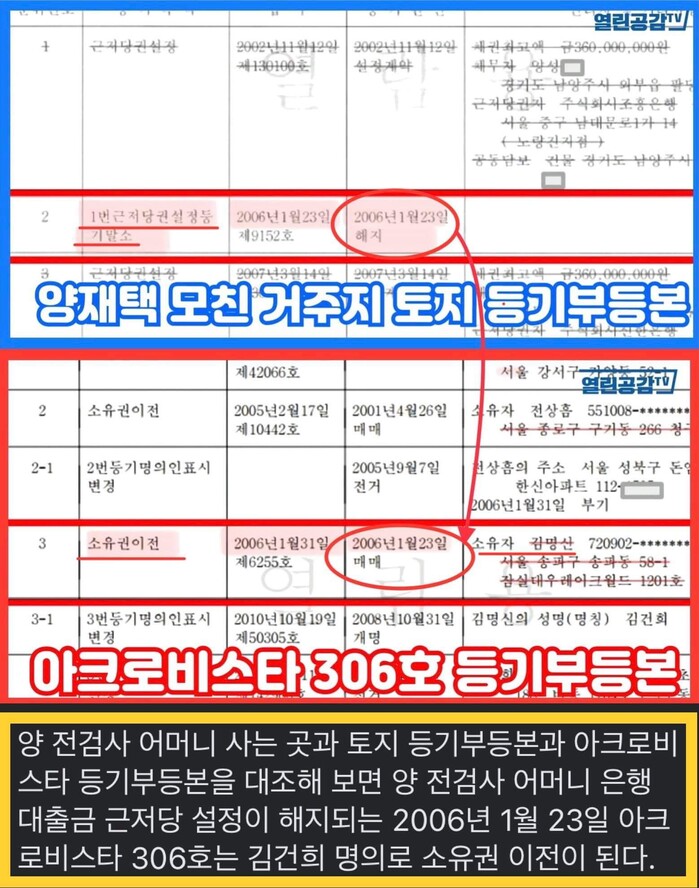 정 대표가 29일 게시한 등기부등본 내용을 보면 양 전 검사의 모친이 "아크로비스타 306호 아파트 대출금을 2회분 정도 남겨놨는데 명신이(김건희)가 나머지 돈을 갚는다고 가져가서 손주 앞으로 명의를 이전하기로 해놓고 자기 앞으로 해놨다"라는 말이 사실로 나타난 것이다.