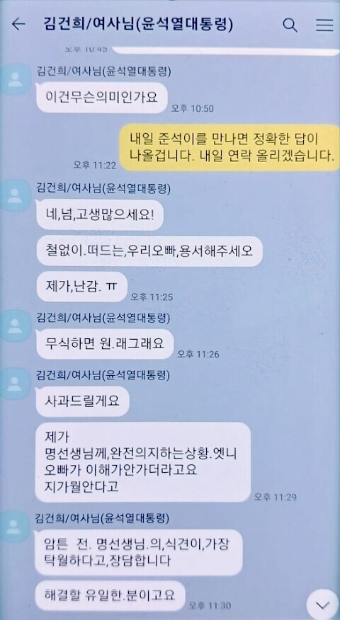 이후 명 씨는 카카오톡 캡쳐 화면을 공개하며 자신이 대선 기간 동안 김건희 최측근으로 인정받았다는 내용을 공개했다.