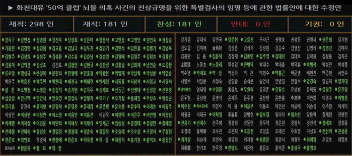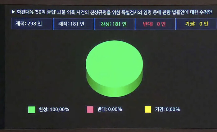 29일 국회는 본회의를 열어 대장동 50억 클럽 뇌물의혹 특검법을 상정해 표결을 진행했다. 오후 3시 30분경 시작된 안건보고는 토론과 반대 토론을 이어 3시 58분 재석 298인, 찬성 181인으로 통과됐다.