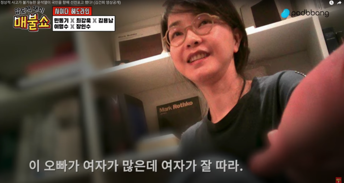 | ▲ '퍼스트레이디' 영화 중 이명수 기자의 손금을 봐주는 김건희 (출처=매불쇼) |