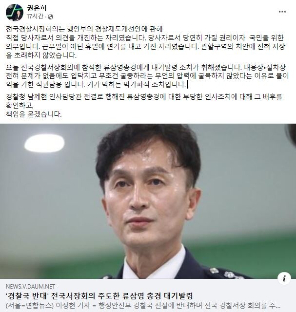 덧붙여 권의원은 류 총경 대기발령 조치에는 “내용상 절차상 전혀 문제가 없었는데도, ‘입 닥치고 무조건 굴종하라’는 무언의 압력에 굴복하지 않았다는 이유로 불이익을 가한 직권남용”이라고 규정했다.