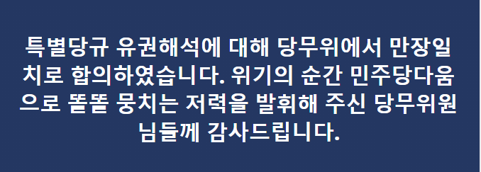 김용민의원 페이스북을 보면 특별당규 유권해석에 대해 당무위에서 만장일치로 합의하였습니다. 위기의순간 민주당 다움으로 똘똘 뭉치는 저력을 발휘해 주신 당무위원님들께 감사드립니다.