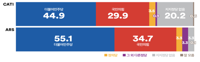 지난 4일 발표된 여론조사 꽃은 민주당 지지율이 전화면접조사 44.9%, ARS조사 55.1%로 지난 조사 대비 각각 1.8%p 상승했다.
