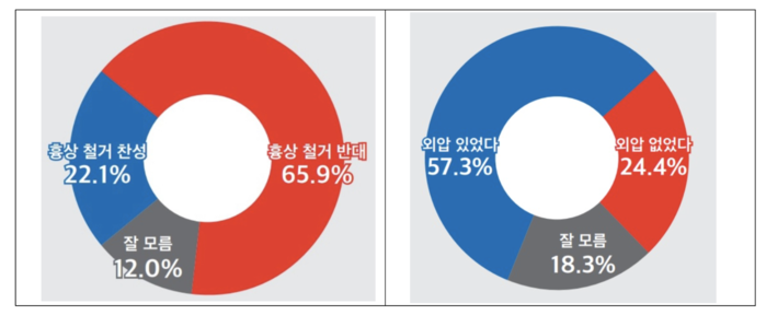 해병대 외압 여부에 대한 여론과 공산주의 경력을 이유로 육사 내 5명의 항일독립 영웅 동상 철거에 대해 찬반 여론을 물은 결과 ‘외압 있었다’는 의견은 24.4%, ‘흉상 철거 찬성’ 의견은 22.1%로 최근 조사된 대 통령 지지율 33∼35% 보다 약 10%p 가량 낮게 나타나고 있다.