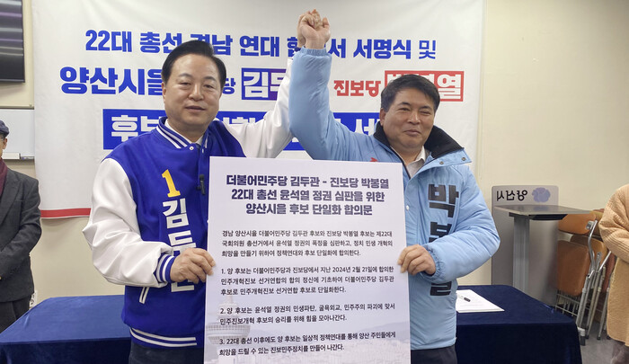 각 당 경남도당위원장인 두 후보는 이날 경남지역 100여명의 시민사회단체 대표 등으로 구성된 총선승리 연석회의와 함께 '윤석열 정권 심판과 대한민국 진보민주 발전을 위한 22대 총선 경남연대 합의문'에 함께 서명했다.