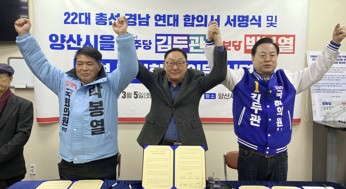 경남 양산을 지역구 더불어민주당 김두관 후보와 진보당 박봉열 후보는 5일 양산시청 프레스센터에서 기자회견을 열고 후보 단일화에 합의해 김 후보를 선거연합 후보로 단일화한다고 선언했다.