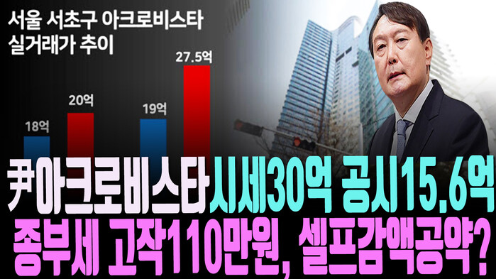 현재 같은 단지에 윤석열 부부 소유 아파트보다 작은 평수가 30억에 매물로 나와 있어, 올해 윤 후보 부부 소유 아파트에 부과될 종합부동산세를 예상해 본 결과 110만 원 정도가 부과될 것으로 추정됩니다.