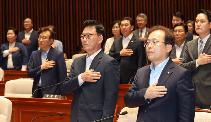 | ▲의원총회에서 국기에 대한 경례를 하고 있는 박광온 원내대표와 의원들 (사진=연합뉴스) |