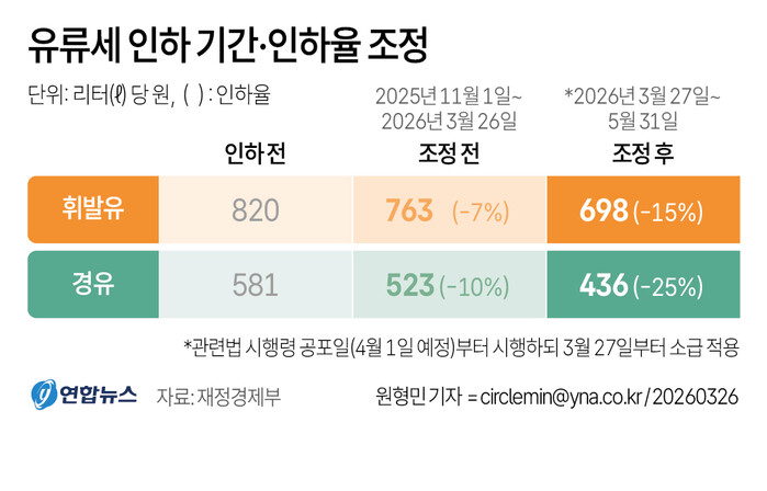유류세 인하 조치는 당초 4월 종료 예정이었으나 5월 말까지 연장됐으며, 국제유가 상황에 따라 추가 인하 가능성도 열어뒀다.