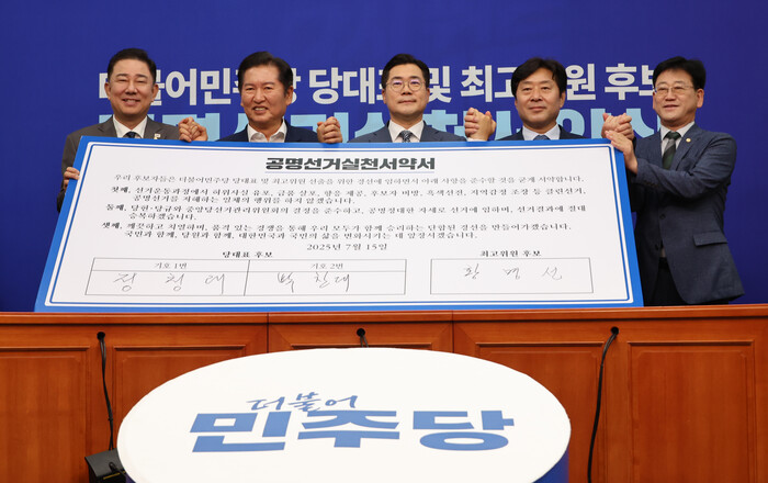 ▲ 더불어민주당 정청래·박찬대 당대표 후보와 황명선 최고위원 후보가 15일 서울 여의도 국회에서 열린 공명선거 실천 서약식에서 서약문에 서명한 뒤 기념촬영 하고 있다. 왼쪽부터 김병기 당대표 직무대행 겸 원내대표, 정청래·박찬대 당대표 후보, 황명선 최고위원 후보, 김정호 중앙당선거관리위원장. 2025.7.15 (사진=연합뉴스)