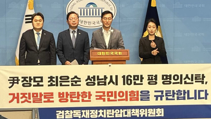 더불어민주당 검찰독재정치탄압대책위원회가 윤석열 대통령 장모 최은순 씨의 성남시 16만 평 명의신탁과 관련하여 거짓말로 국민을 속인 국민의힘을 규탄한다는 기자회견을 진행했다.