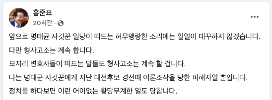 해당 통화녹취가 공개된 이후 홍 시장은 페이스북에 글을 올려 “앞으로 명태균 사기꾼 일당이 떠드는 허무맹랑한 소리에는 일일이 대꾸하지 않겠다”면서 “형사고소는 계속한다. 모지리 변호사들이 떠드는 말들도 형사고소는 계속 할 것”이라고 말했다.