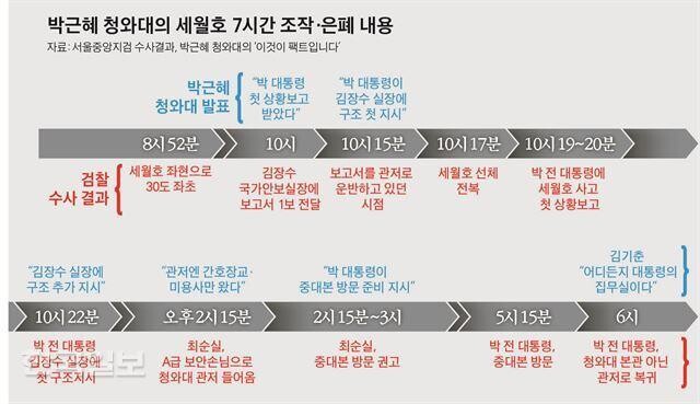 그러나 검찰 조사 결과 박근혜씨에 대한 첫 보고는 오전 10시가 아닌 세월호가 전복된 뒤인 10시 19~20분 사이에 이뤄졌던 것으로 확인됐다.
