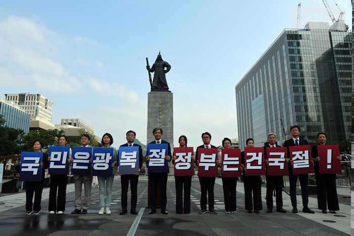 | ▲조국혁신당 광복절 기자회견 퍼포먼스 모습 (사진=조국혁신당) |