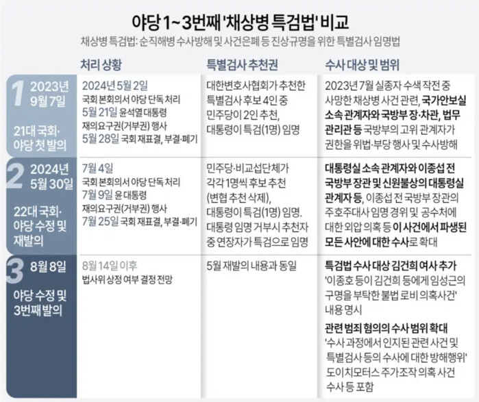 김 원내정책수석부대표는 "지난 2차 발의와 달라진 가장 중요한 것은 임성근 전 해병대 1사단장에 대한 이종호 전 블랙펄인베스트 대표의 구명 로비 의혹을 추가하는 등 수사 대상을 확대했다는 것"이라며 "수사 준비 기간 중 증거 수집을 할 수 있다는 조항도 포함해 특검을 실질화시키는 방식으로 강화했다"고 말했다.