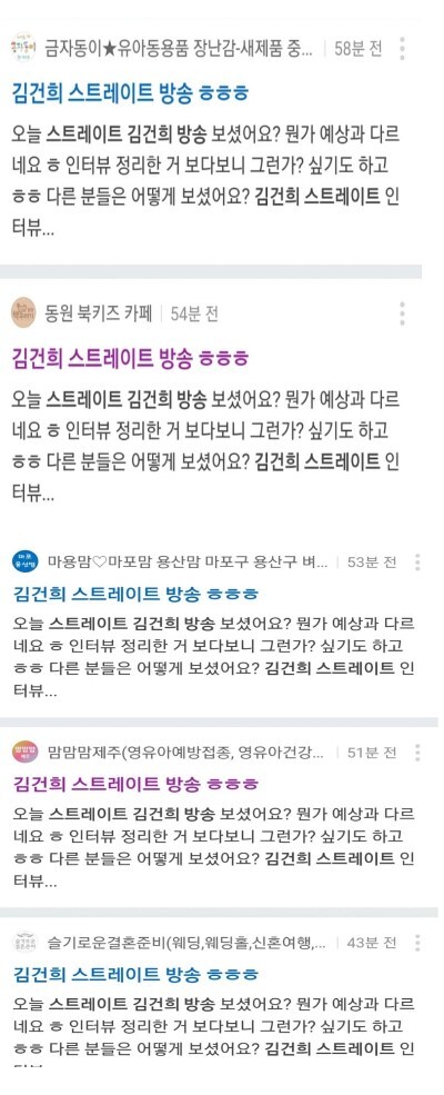 실제로 16일 MBC스트레이트에 김건희 관련 방송이 나간 후, 각 지역 맘 카페에는 ‘김건희 스트레이트 방송ㅎㅎㅎ’ 라는 제하의 같은 내용의 글이 올라와 방송 내용에 대해 별거 아니었다라는 식의 여론몰이를 하는 정황이 포착됐다.
