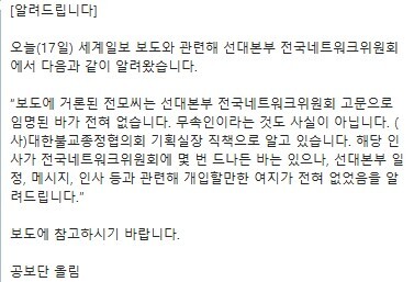 | ▲ 국민의힘 전국네트워크위원회에서 17일 자당 공보단을 통해 세계일보 단독기사를 반박입장을 냈다. © 국민의힘 공보단 |