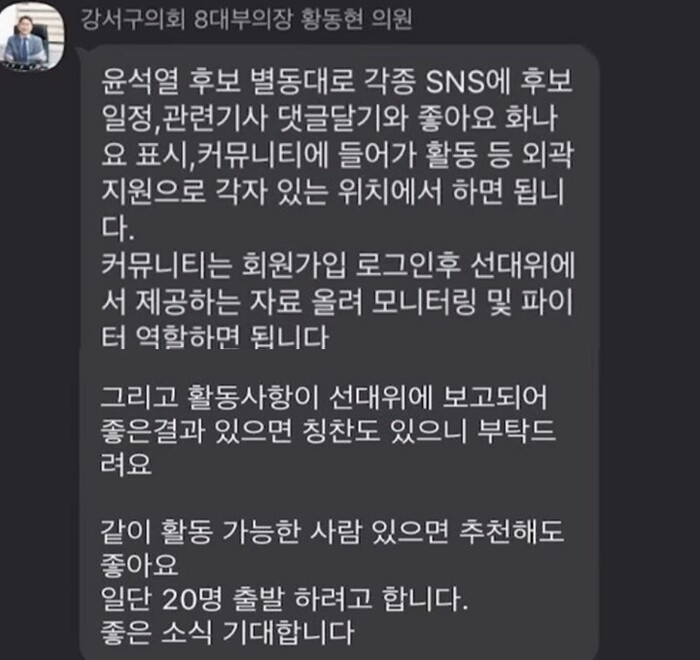 황 구의원은 당시 댓글부대원으로 추정되는 사람들에게 보낸 문자 메시지에서 “윤석열 후보 별동대로 각종 SNS에 후보 일정, 관련기사 댓글달기와 좋아요 화나요 표시커뮤니티에 들어가 활동 등 외곽 지원으로 각자 있는 위치에서 하면 됩니다. 커뮤니티는 회원가입 로그인후 선대위에 서 제공하는 자료 올려 모니터링 및 파이터 역할을 하면 됩니다”라는 내용을 발송했다.