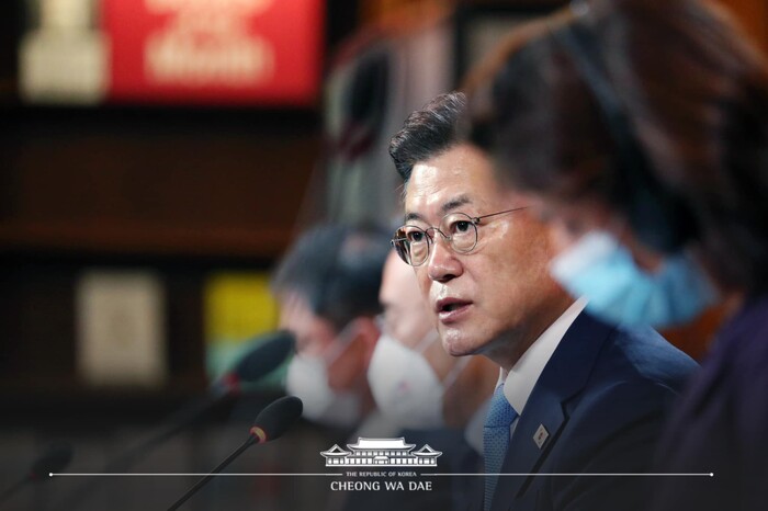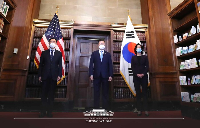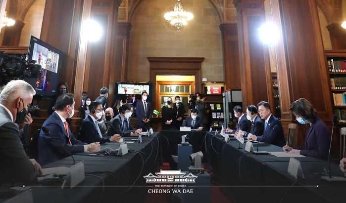 21일 미국 방문 셋째 날 오전, 문재인 대통령은 미 상무부에서 열린 ‘한미 비즈니스 라운드테이블’에 참석, 반도체·배터리·바이오 등 핵심 산업의 양국 주요 기업인들을 만났다.