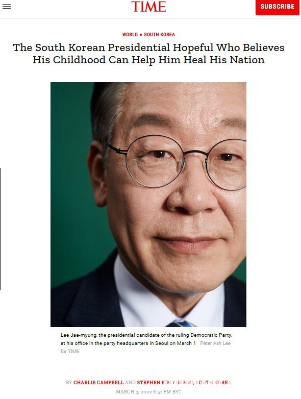 미국 시사주간지 타임이 "이재명 더불어민주당 대선 후보 인터뷰 기사"를 3일 자 온 라인판에 실었다. 타임은 이 후보를 “자신의 어린 시절 경험이 나라를 치유하는 데 도움" 이 될 거라 믿는 유력 주자 (The South Korean Presidential Hopeful Who Believes His Childhood Can Help Him Heal His Nation) 로 소개했다.