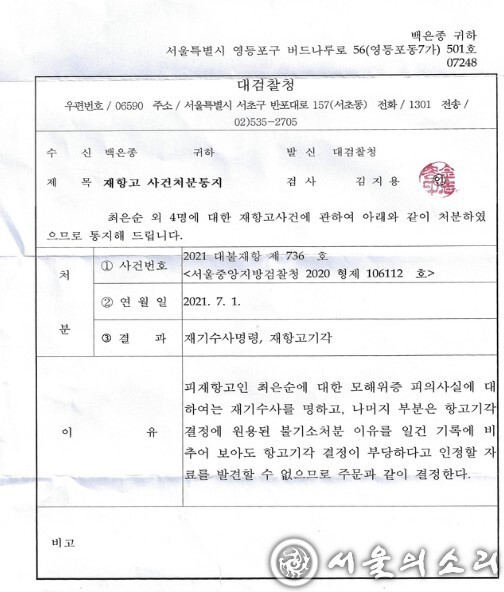 한편, 윤 전 총장 장모 최 씨가 동업자 정대택 씨와의 스포츠플라자 소유권 매입 수익금을 지불하지 않기 위해 “동업계약은 강압에 의한 무효 계약”이라며 동업계약서 작성했던 법무사를 회유해 거짓 증언을 사주한 ‘모해위증 사건’에 최종항고에 대해 대검찰청은 지난 1일 재수사 지시를 내렸다.