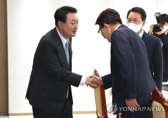 | ▲ 2022.6.10 대통령실 청사 대접견실에서 악수하는 윤석열과 권성동 국민의힘 원내대표 (사진=연합뉴스) |