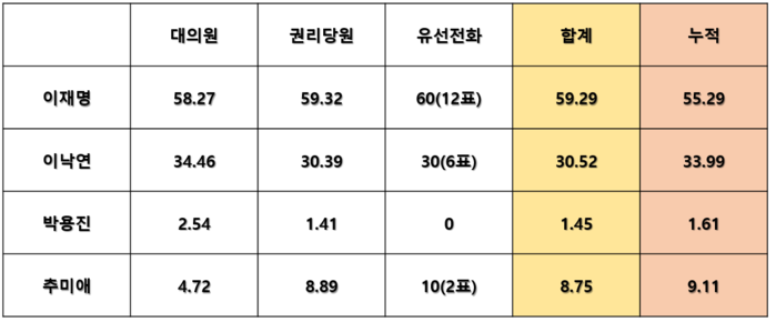 추미애 후보와 박용진 후보는 각각 8.75%(8388표), 1.45%(1385표)의 득표율을 기록했다.