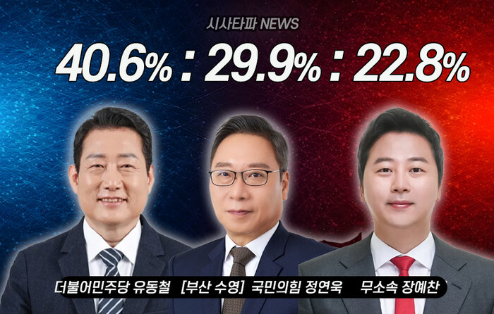 더불어민주당 유동철 후보는 40.6%, 정연욱 국민의힘 후보는 29.9%, 장예찬 무소속 후보가 22.8%로 보수 지지세가 확연하게 절반으로 나뉜 양상이다.