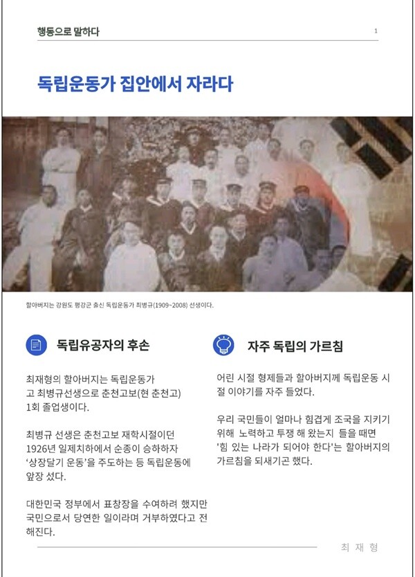 지난 6월 제작된 최재형 대선 홍보물 첫 페이지에 자신을 독립유공자 후손이라 자랑하고 있다. 부친의 회고록을 바탕으로 했으니 거짓이 또 다른 거짓을 낳고 부풀려지게 되었다. 독립유공자는 법적 용어로 보훈처가 공적을 심사하여 국가가 지정한 독립운동가인데, 최병규는 공적심사를 받은 사실조차 없는 데에도 최재형이 홍보물에 버젓이 국가유공자 후손으로 자랑한 것은 의도적으로 기획한 것이라 보인다.