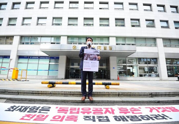 | ▲ 안민석 민주당 의원이 지난 13일 최재형 후보 캠프가 있는 여의도 빌딩 앞에서 최재형 후보 친일의혹 직접 해명을 요구했다 © 안민석 의원실 제공 |