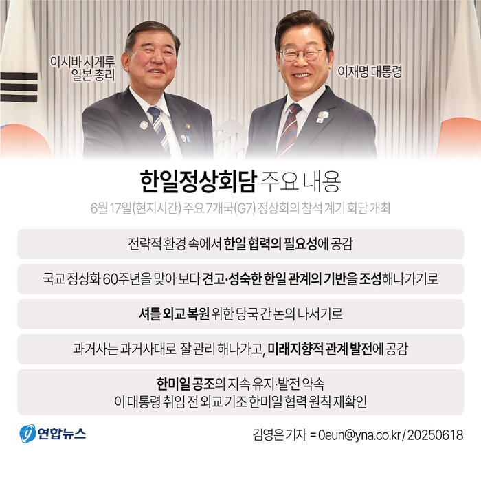 이 대통령은 이시바 시게루 일본 총리와 회담을 갖고 양 정상은 '셔틀외교' 재개에 대한 의지를 재확인했고, 당국 간 논의를 진전시켜 나가기로 해 한일관계 회복도 성과로 꼽힌다.