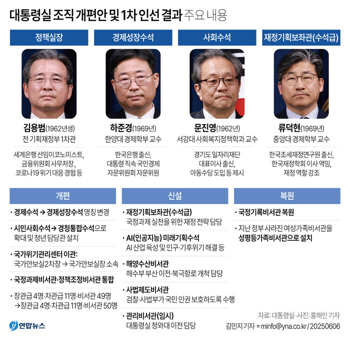 강훈식 대통령 비서실장은 이날 브리핑에서 이 같은 내용을 담은 대통령실 조직개편안과 1차 인선을 발표했다.