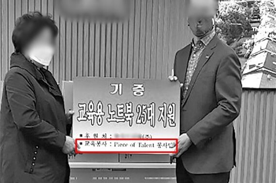 | ▲충북 소재 보육원의 2021년 소식지에 실린 사진. 노트북 기부 사실을 담은 팻말에 한동훈 법무부장관 후보자의 딸이 주도했던 동아리 이름(Piece Of Talent)이 담겨 있다. |