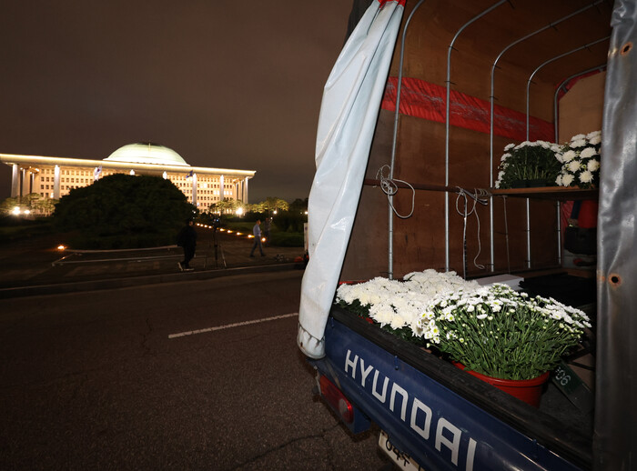| ▲ 국힘, 국회에 양평공무원 분향소 설치 시도…국회사무처 불허. 사진은 해태상 인근에 분향소를 설치하기 위해 놓인 물품들. 2025.10.12 (사진=연합뉴스) |