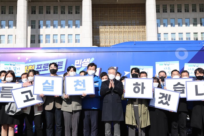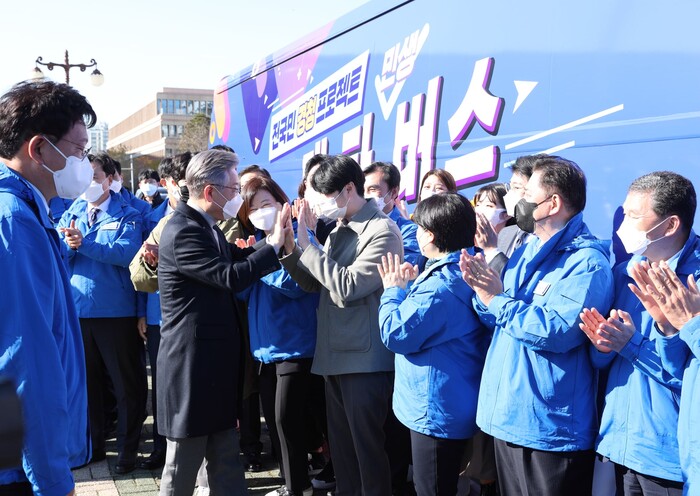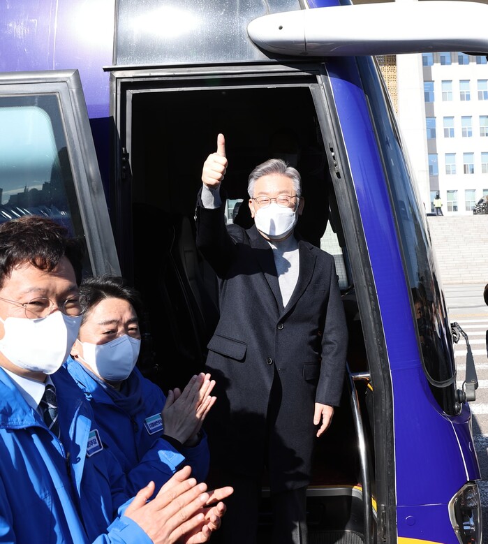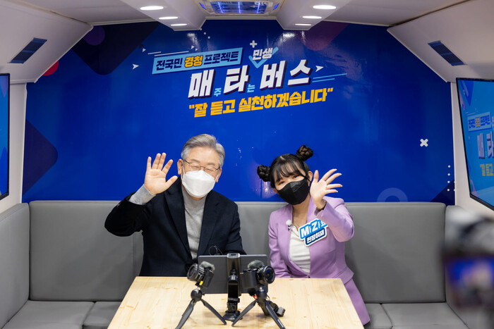 이재명 더불어민주당 대선후보는 오늘부터 전국곳곳을 〔매〕주 〔타〕는〔버스〕를 탑니다.
