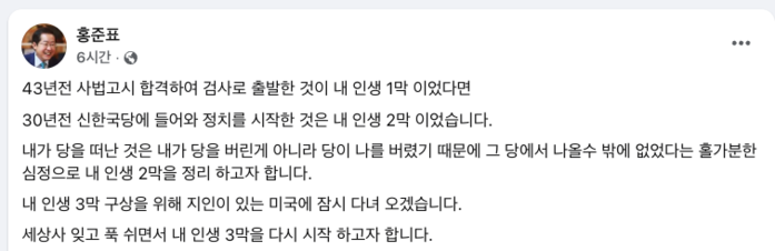 국민의힘 대선 후보 경선에서 탈락하며 정계 은퇴를 선언한 홍준표 전 대구시장이 "내 인생 3막 구상을 위해 지인이 있는 미국에 잠시 다녀오겠다"라는 뜻을 밝혔다.