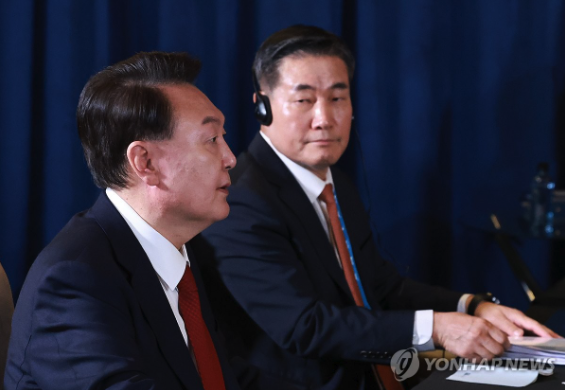 | ▲ 윤석열과 신원식 안보실장 2024.11.16 한미일 정상회의 (사진=연합뉴스) |