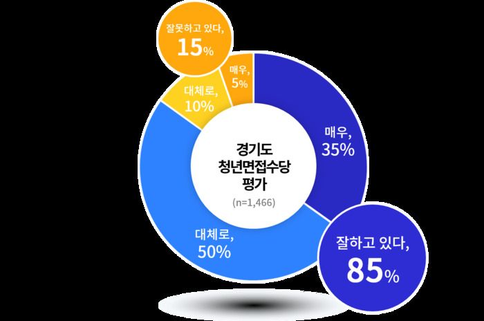경기도가 지난해부터 도내 만 18~39세 청년에 면접 활동비로 연간 최대 30만원을 지역화폐로 지급하는 ‘경기도 청년면접수당 사업’에 대해 지난 4월 30일~5월 31일 경기도 여론조사를 한 온라인 패널 중, 도내 만 18~39세 청년 1,466명을 대상으로 조사를 실시한 결과 경기도 청년 85%가 ‘잘하고 있다’고 평가했다.