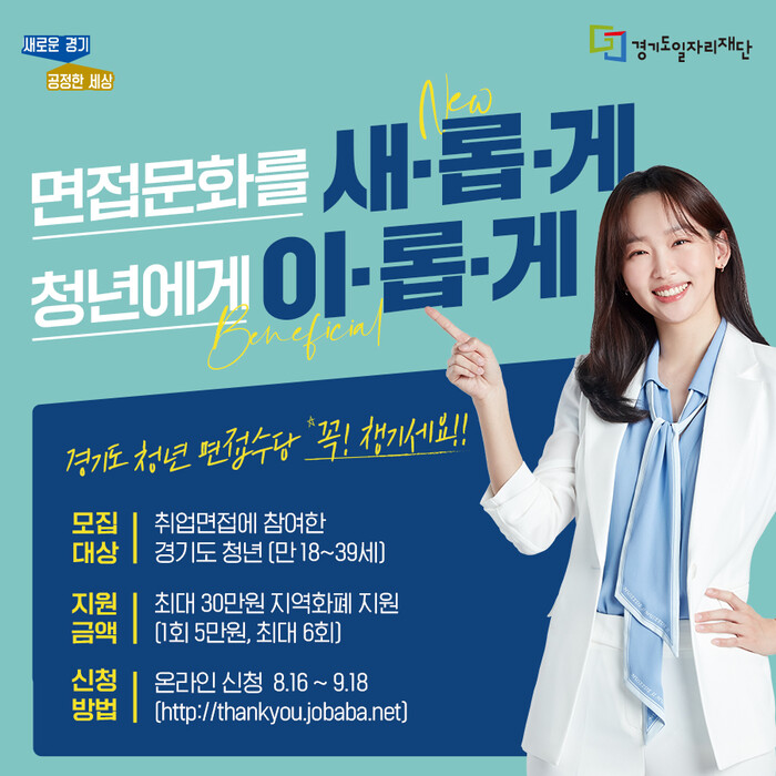 신청부터 지급까지 약 60일 정도 소요됐던 지급기일도 올해부터 30일로 단축해 편의를 높였다. 신청 대상은 신청일 기준 주민등록상 주소지가 경기도인 만 18세 이상 39세 이하로, 취업 면접에 응시한 경기도 청년이다. 타 지원금 중복 수급자(실업 급여, 청년 구직 활동 지원금 등)는 지원 대상에서 제외된다.