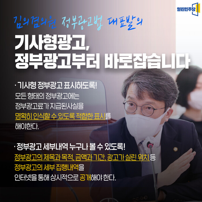 정부광고를 바로잡는 일. 국민의 알권리를 보장하고 언론의 신뢰를 회복하는 길입니다. 법안이 통과될 수 있도록 최선을 다하겠습니다. 많은 관심과 지지 부탁드립니다.