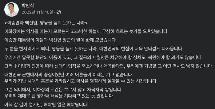 | ▲ 이승만에 대한 시각을 밝힌 2022년 페이스북 게시물 (화면 캡쳐=박민식 페이스북) |