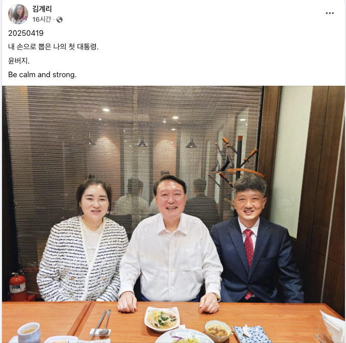| ▲ 19일 윤석열 탄핵심판 尹측 김계리 변호사의 게시글 (출처=김계리 페이스북) |