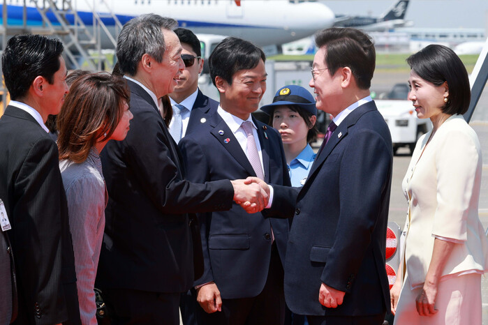 | ▲ 1박2일 일정으로 일본을 방문한 이재명 대통령이 23일 일본 도쿄 하네다공항에 도착해 미즈시마 고이치 주한일본대사와 인사하고 있다. 2025.8.23 (사진=연합뉴스) |