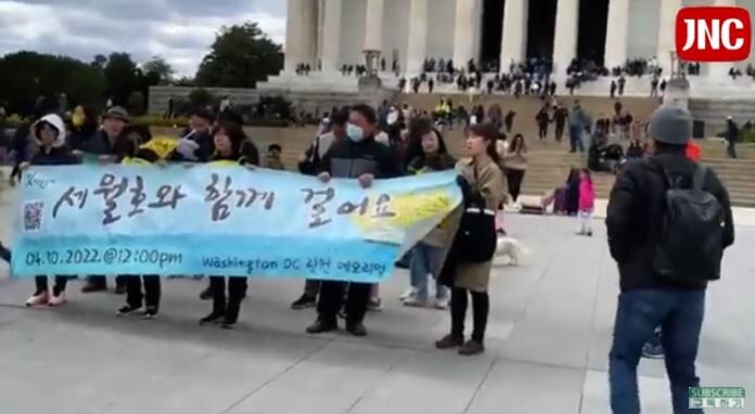 세월호를 기억하는 들꽃모임 한인들은 아이들을 기억하는 모든 사람들과 함께 하자고 호소하며, 희생자의 이름을 하나하나 부르며 "세월호와 함께 걸어요" 플랭카드를 들고 함께 걸었다.