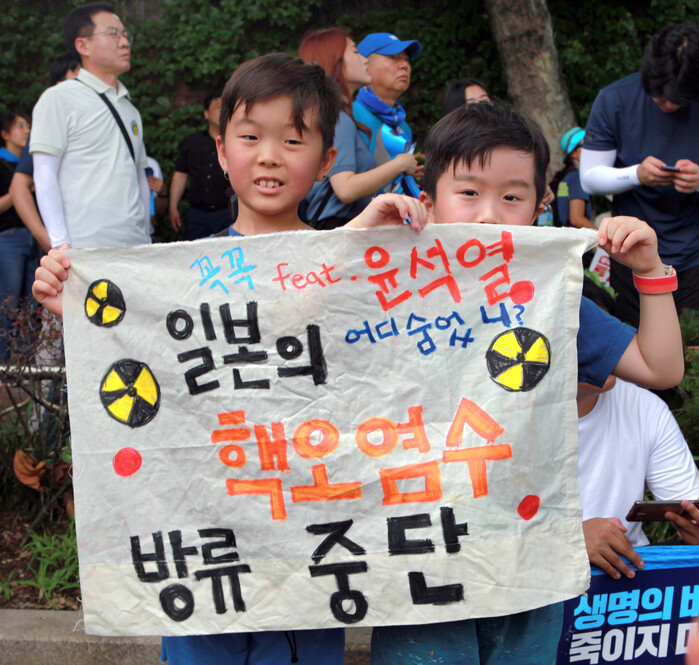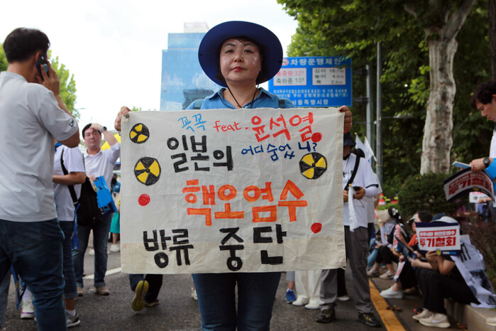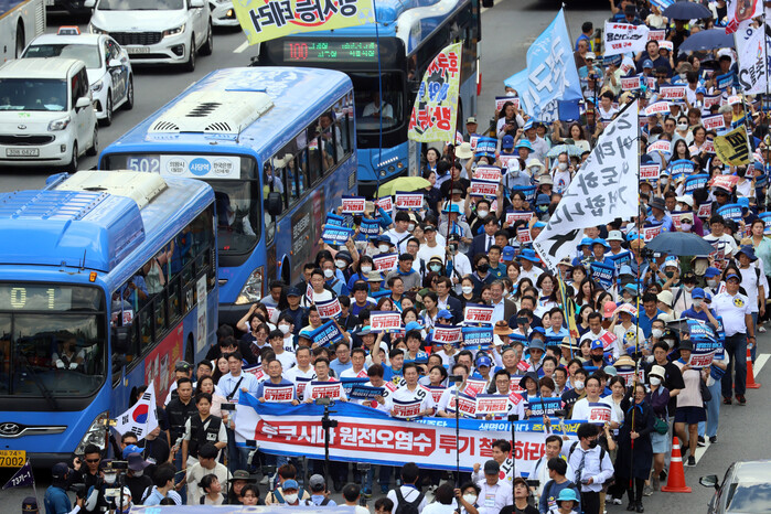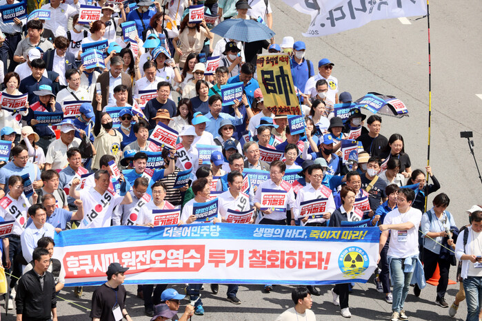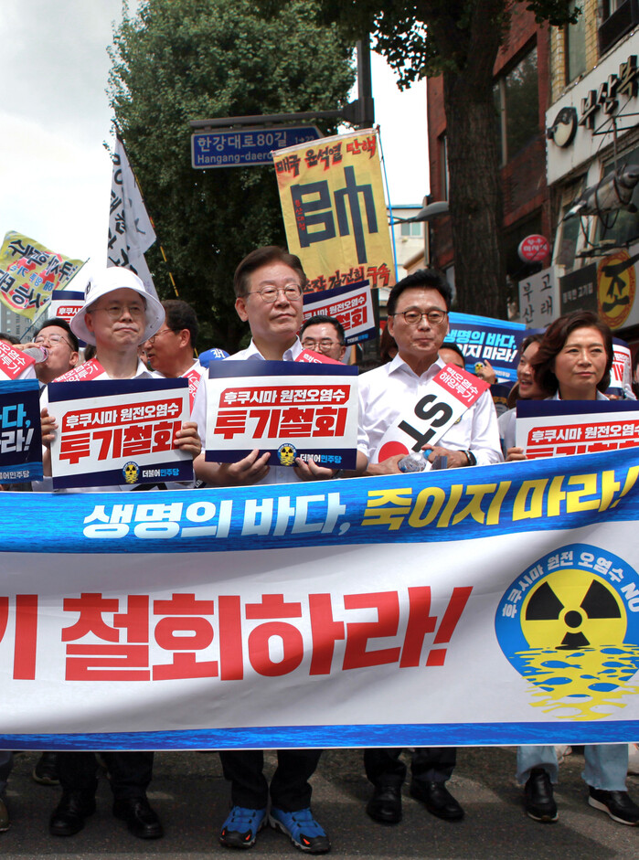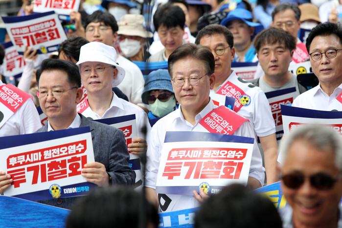 더불어민주당 지도부는 25일 오전 10시부터 광화문 광장 앞에서 '후쿠시마 오염수 투기 중단 국민 행진'을 진행했다.