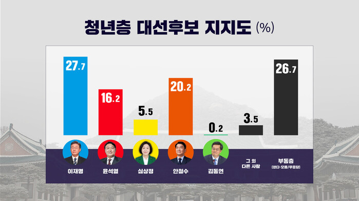 조사 시점은 국민의힘 윤석열 후보가 선대위를 재구성하고, 이준석 대표와 충돌하다 극적으로 화해한 직후이다. 지지 후보가 없다거나 모름 또는 응답하지 않은 청년층은 26.7%에 달한다.