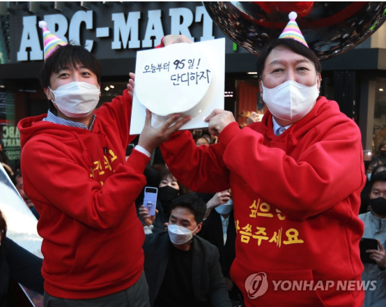 | ▲ 2021.12.18 지지자로부터 받은 생일케잌 자랑하는 당시 대선 후보 윤셕열과 이준석 (사진=연합뉴스) |