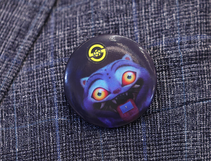 | ▲ 청와대 영빈관에서 열린 이재명 대통령 취임 100일 기자회견에서 한 취재기자가 이날 행사 참석자들에게 나눠준 '케이팝 데몬 헌터스' 캐릭터 '더피'로 만든 핀버튼을 가슴에 달고 있다. 2025.9.11 (사진=연합뉴스) |