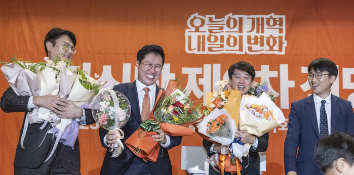 | ▲ 개혁신당 당 대표 선거에 단독 출마한 이준석 의원이 27일 국회의원회관 대회의실에서 열린 개혁신당 제2차 전당대회에서 당 대표로 확정된 뒤 최고위원 선출자들과 꽃을 받고 있다. (왼쪽부터) 김정철, 김성열 최고위원, 이 대표, 주이삭 최고위원. 2025.7.27 (사진=연합뉴스) |