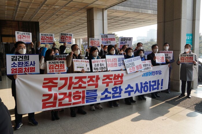 더불어민주당 의원들은 이날 서울중앙지검을 방문해 김건희 씨 "도이치모터스 주가조작 사건 관련 즉각 소환조사 촉구" 를 요청하는 기자회견을 가졌다.